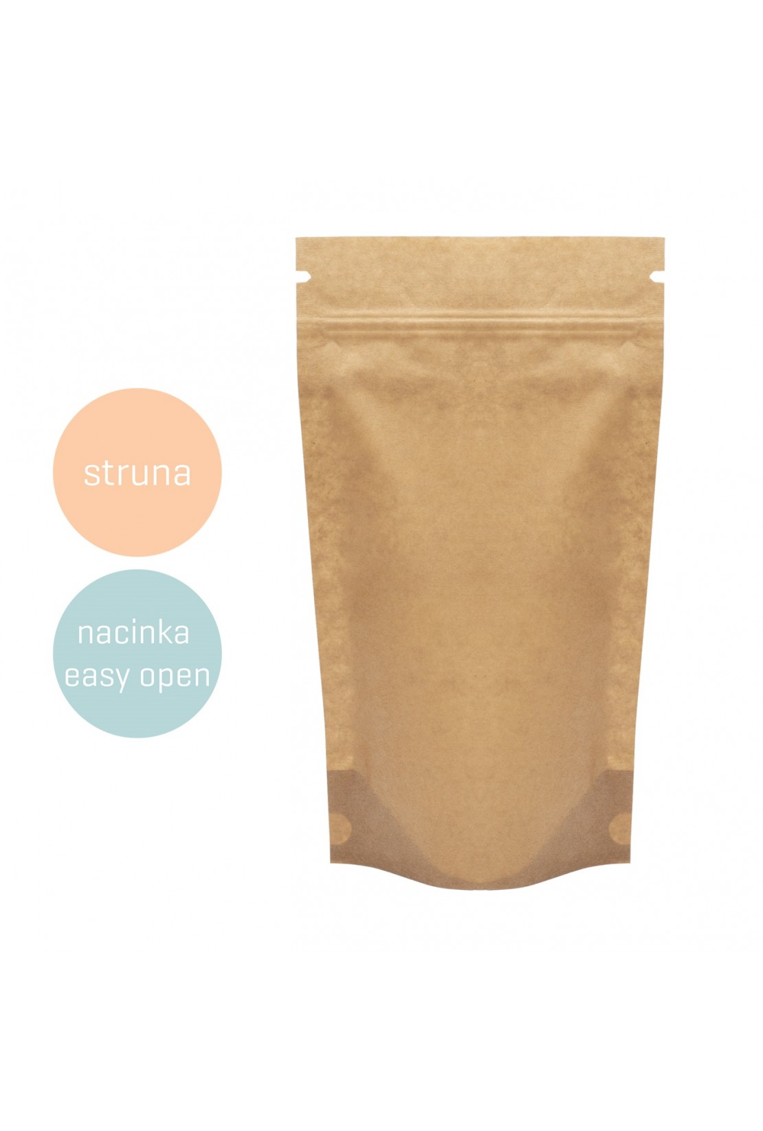 Doypack made of PET/PE barrier film covered with brown paper. Ziplock allows multiple opening and closing of the bag. Easy-open perforation is used for easy opening. The product specification can be found in the "Product Details" tab.