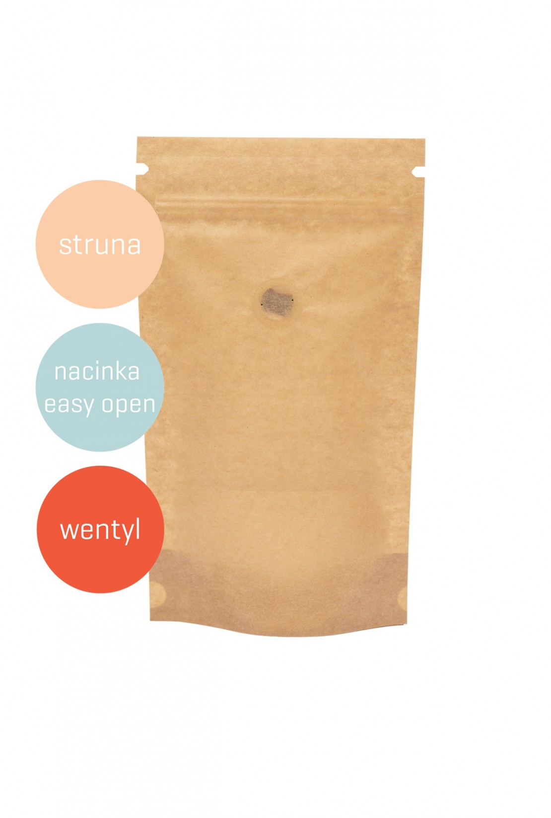 Doypack made of PET/PE barrier film covered with brown paper. Ziplock allows multiple opening and closing of the bag. Easy-open perforation is used for easy opening. The valve is responsible for the discharge of accumulating gases inside the package, prevents the package from exploding when packing eg. coffee beans. The product specification can be found in the "Product Details" tab.