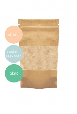 Doypack made of PET/PE barrier film covered with brown paper. Ziplock allows multiple opening and closing of the bag. Easy-open perforation is used for easy opening. The product specification can be found in the "Product Details" tab.
