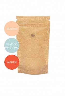Stojące opakowanie foliowe wykonane z aluminiowej folii barierowej. Struna umożliwia wielokrotne otwieranie i zamykanie worka. Nacinka służy do łatwego otwierania. Wentyl odpowiedzialny jest za odprowadzanie gromadzących się gazów wewnątrz opakowania, zapobiega rozerwaniu się opakowania przy pakowaniu np. kawy ziarnistej. Specyfikację produktu znajdą Państwo w zakładce "Szczegóły Produktu".